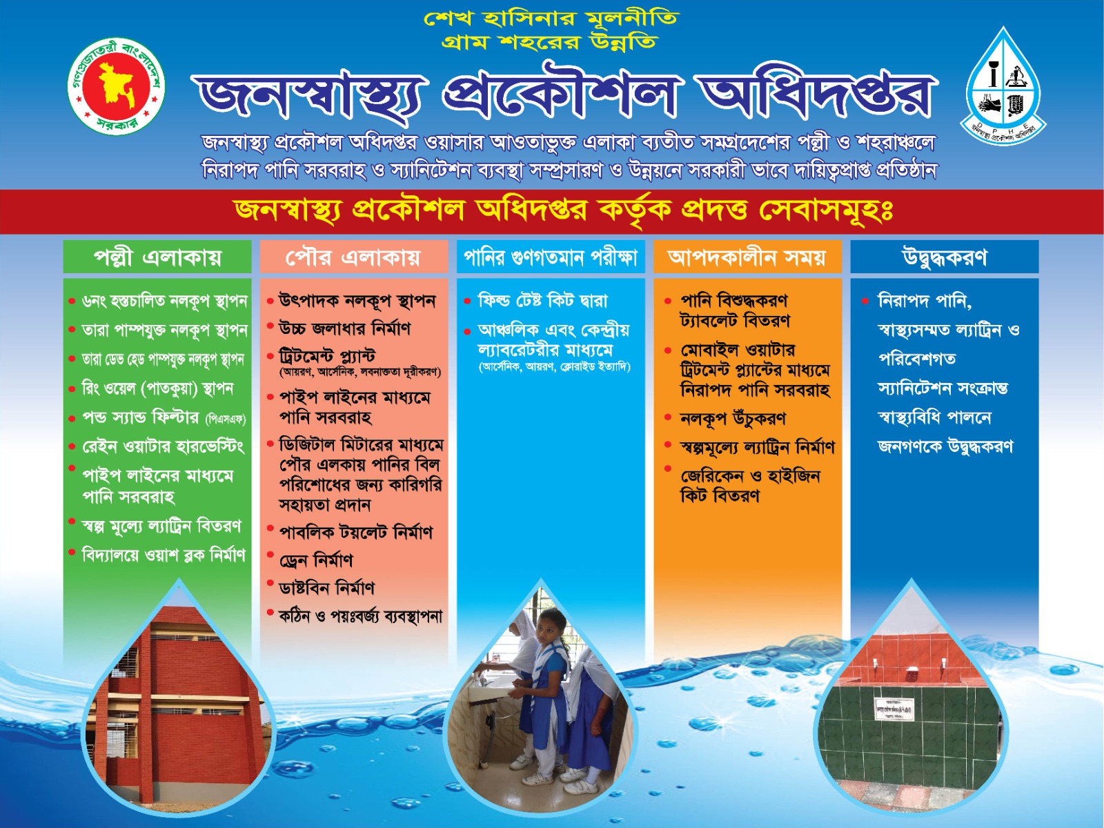 | ৯। | কারিগরি সহায়তা | বাংলাদেশর পল্লী এলাকায় ইউনিয়ন পরিষদ ও পৌর এলাকায় পৌরসভা সমুহকে চাহিদার প্রেক্ষিতে নিরাপদ পানি সরবরাহ ও স্যানিটেশন অবকাঠামো নির্মানে কারিগরি সহায়তা প্রদান করা হয়ে থাকে। এছাড়াও সকল সরকারী বেসরকারী প্রতিষ্ঠান এবং জনসাধারনের আবেদনের প্রেক্ষিতে নিরাপদ পানি সরবরাহ ও স্যানিটেশন অবকাঠামো নির্মানে কারিগরি সহায়তা প্রদান করা হয়। |